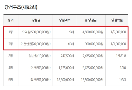 당첨금은 1등 오억원(500,000,000원), 2등 이천만원(20,000,000원), 3등 일만원(10,000원), 4등 오천원(5,000원), 5등 일천원(1,000원)입니다. 총 당첨금은 1등 4,500,000,000원, 2등 900,000,000원, 3등 2,475,000,000원, 4등 5,625,000,000원, 5등 13,500,000,000원입니다.