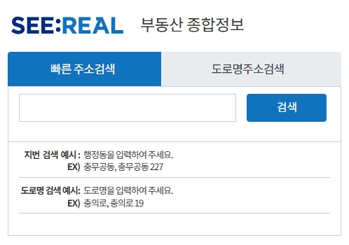 홈페이지(씨:리얼 (SEE:REAL))에 접속하시면 메인화면에 있는 검색창을 활용하여 부동산 종합정보를 알아볼 수 있습니다. 검색은 아래 그림처럼 빠른 주소검색과 도로명 주소검색으로 하실 수 있어요.