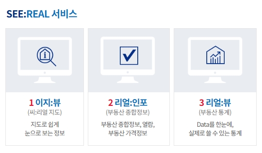 SEE:REAL은 쉽고 편리하게 부동산의 시야를 넓혀준다는 의미의 SEE와, 실생활에 도움되는 정보를 뜻하는 REAL이 결합된 브랜드 네임으로, 일반인 공모에서 최우수 평가를 받은 안이라고 합니다.