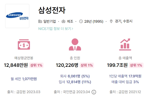 기업요약 부분을 보시면 해당 기업에 대한 정보를 확인할 수 있습니다. 현재날짜를 기준으로 삼성전자의 예상평균연봉은 12,848만원으로 상위 1%에 속하며, 월급여는 세전으로 해도 1천만원이 넘네요.