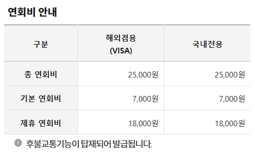 저는 현재 T라이트 농협카드를 이용하고 있는데요, 실적만 충족되면 자동으로 통신료가 할인되기때문에 혜택을 따로 신경쓸 필요가 없어서 편하더군요. 삼성카드에서도 동일한 이름의 카드를 제공하고 있으며, 오늘은 티라이트 삼성카드가 제공하는 혜택에 대해서 알아보려고 합니다. 먼저 연회비의 경우 국내전용과 해외전용 모두 2만5천원이고, 가족카드는 제공하지 않습니다.