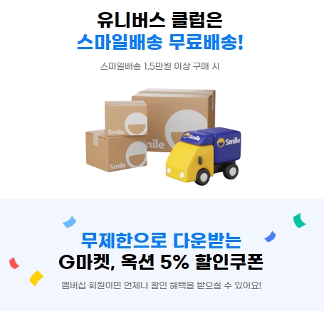 다음은 기본혜택을 보겠습니다. 유니버스클럽은 스마일배송 1만5천원 이상 구매시 무료배송을 해드립니다. 또한 무제한으로 다운받는 G마켓 및 옥션 5% 할인쿠폰을 제공합니다.