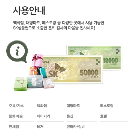 다음은 SK상품권 사용처에 대한 안내를 보겠습니다. 백화점/대형마트/레스토랑 등 다양한 곳에서 사용할 수 있는데요, 먼저 주유/가스의 경우 전국의 SK주유소와 SK가스충전소에서 사용가능합니다.