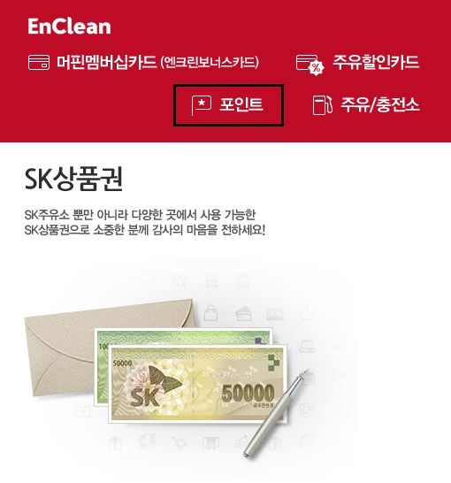 엔크린 홈페이지에 접속하여 [포인트] 및 [SK상품권] 메뉴순으로 들어가시면 이용관련 안내를 확인할 수 있습니다. SK주유소 뿐만아니라 다양한 곳에서 사용이 가능한 SK상품권으로 소중한 분께 감사의 마음을 전할 수 있다고 하네요.